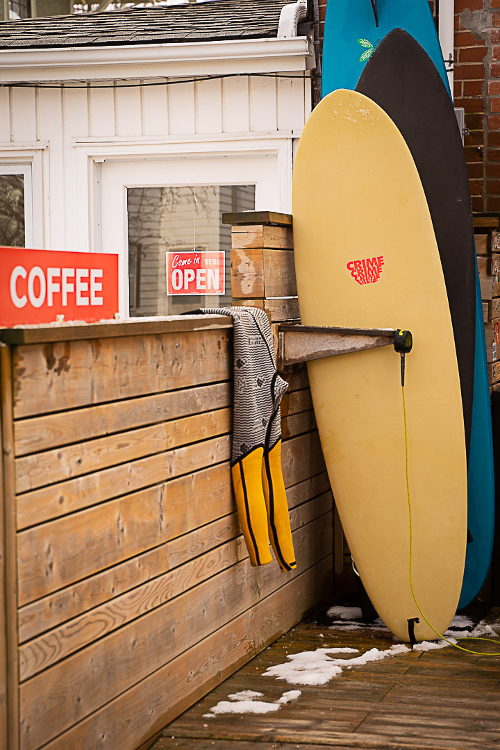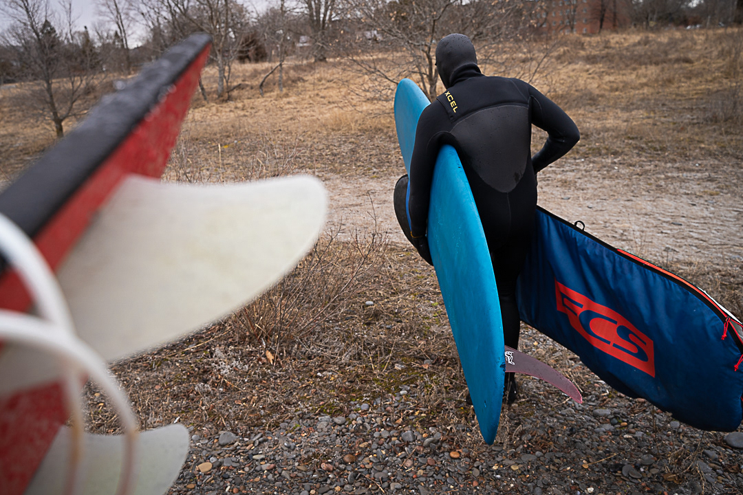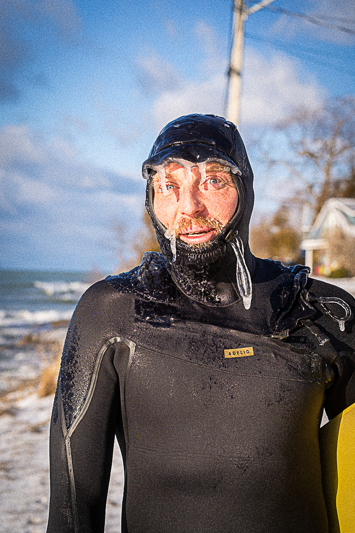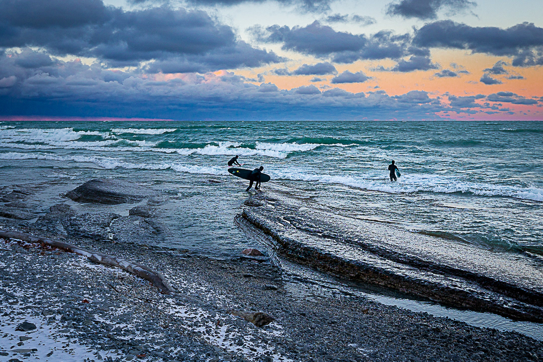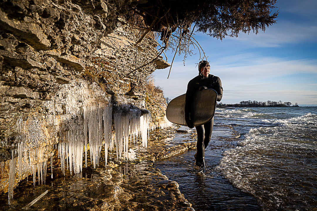 “It’s tough because it’s not predictable like the ocean. I feel like the lake surfer is pretty dedicated to learning how to find waves—and then getting into the cold water too,” he laughs. “Every time you duck under a wave or paddle out, you get an ice cream headache. It’s pretty intense. It gets trippy in winter because the air can be –20 and the water is actually warmer—it’s super weird.”