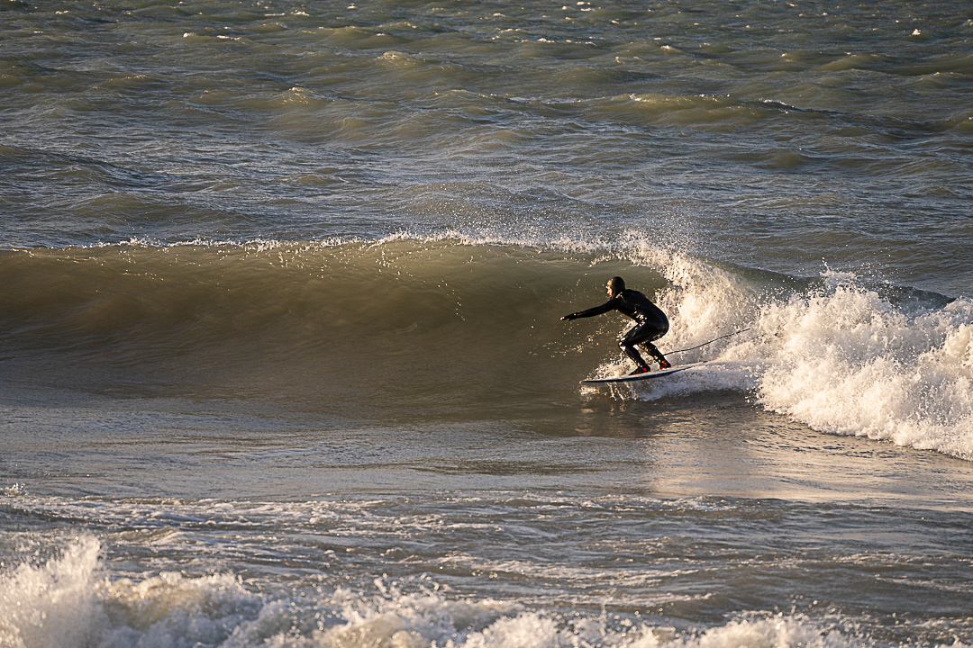 A quick check down a long path reveals exactly what they hoped for. They don’t even finish the walk before turning back for their gear. In the frosty air, feet and arms wrestle into tight, stiff wetsuits. one surfer using plastic bags to slide his feet through the leg holes. Getting into these suits is hard, but getting out is worse.