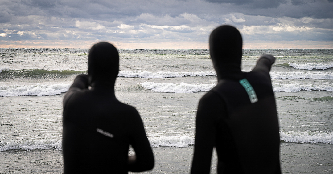 The “Dad Patrol”—a crew of surf buds including Tyler Beatson, Andrew Seale, Ian Carleton, Neil Rimmer, and Robin Kaufman—are local surfers who put all the pieces together for days like this. Their pre-mission rendezvous takes place at OAK Clothing Company/Surf Club in Wellington, Ontario, where Seale lays out the plan before the group heads off in convoy through farmers’ fields toward Canada’s third coast: a secret surf spot along the north shore of Lake Ontario, nicknamed Calder Point. A few inches of snow had fallen the night before, and temperatures had dropped low enough to freeze car door locks. Still, this wasn’t even the –20°C weather lake surfers often endure in winter—it was considered a warm fall day. At the beginning of the season, the best—and coldest—conditions were still to come.